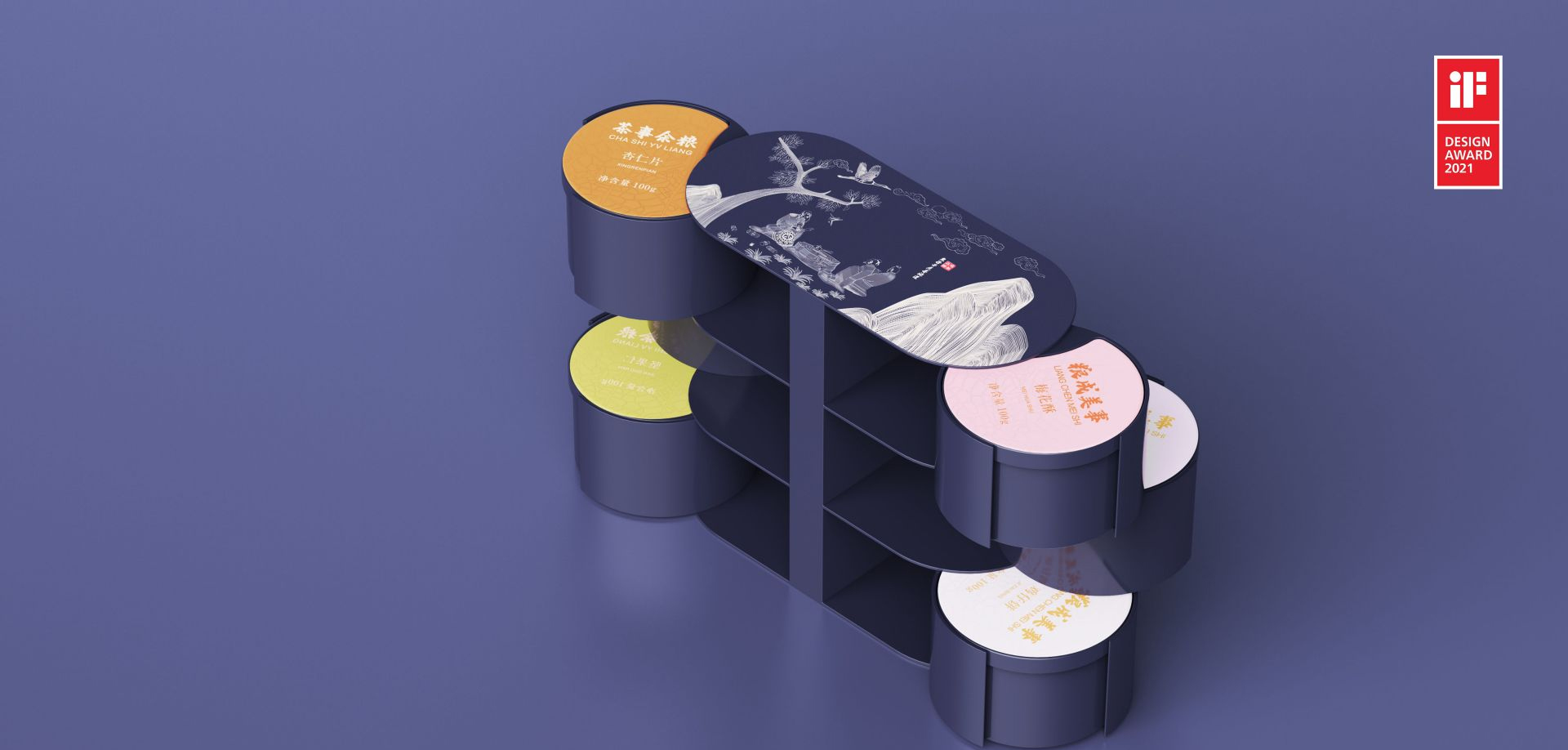 这套取名"茶事余粮"的高端茶点包装,在包装设计结构上采用分体式和一体式设计,在使用呈现上既可以是一套高级的茶点托盘,也可以单独取出小包装分享茶点,这款包装寓意喝茶谈事吃余粮。整体视觉上重点描绘中国远古文化玄微真人鬼谷子在清溪云梦山谷中喝茶论道的典故通过现代插画形式描绘在了包装上,传统文化的灵魂由此注入这款包装,这使得这款包装在内涵上得以提升,也让买这款茶点包装的消费者拥有了品读寓意的想象空间。并且内置的贴心健康配置表,更加关怀消费者,对于茶和茶点如何搭配的贴心提示这也让消费者有了更美好的消费体验感受,为品牌价值提供了载体。