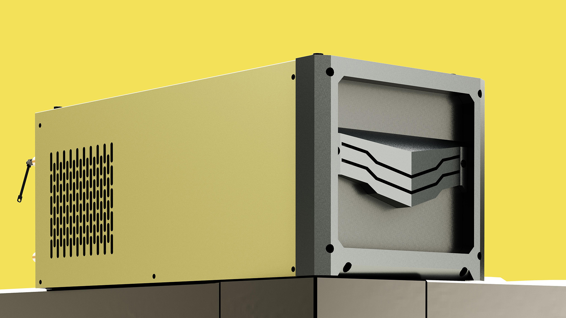 机甲风格电源设备正面以及侧面搭配散热孔采用百叶窗式斜向设计,既解决散热,又避免了灰尘飞入。操控面板处设计了透明保护罩,防止火花飞溅烫伤面板,侧面采用饭金设计,更加坚固耐用。