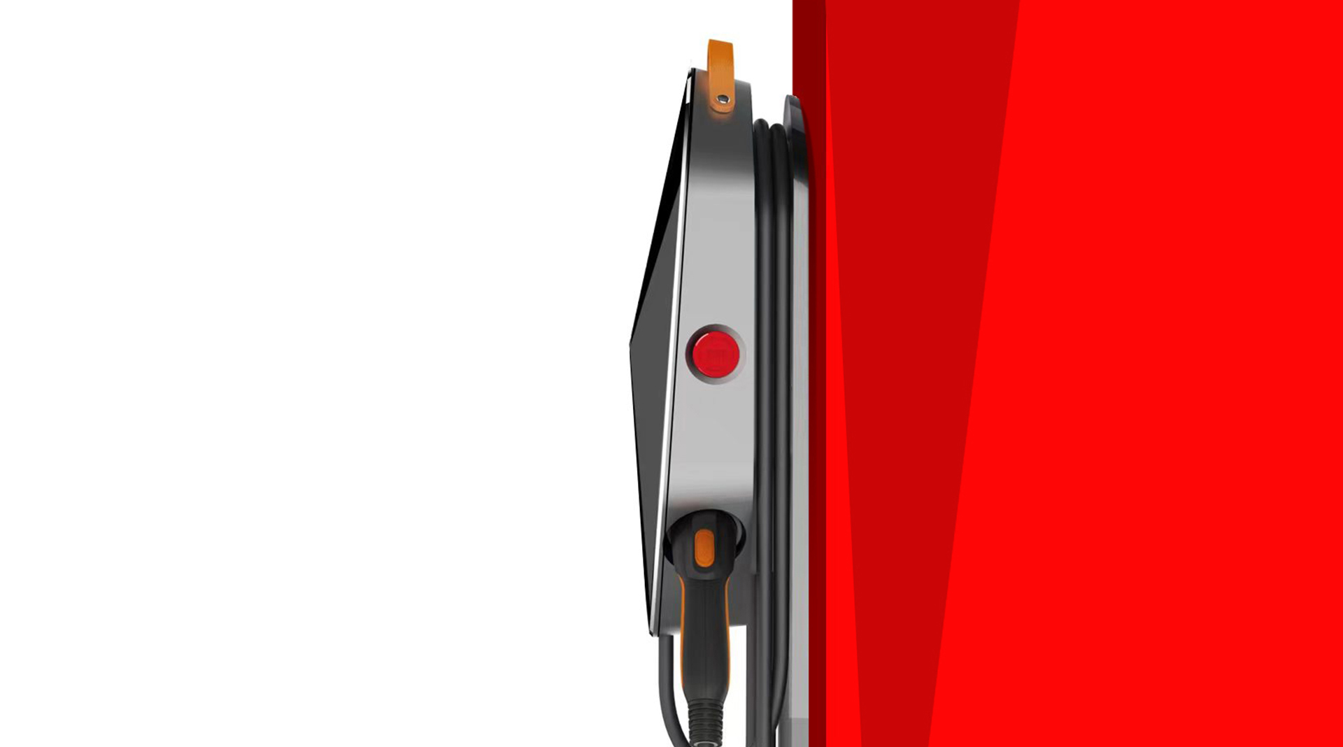小牛皮提手设计解决了搬运时需要双手的问题,便于搬运。斜下充电枪挂口设计,解决了常规水平挂口,尘土杂质等残留物容易积存的问题。