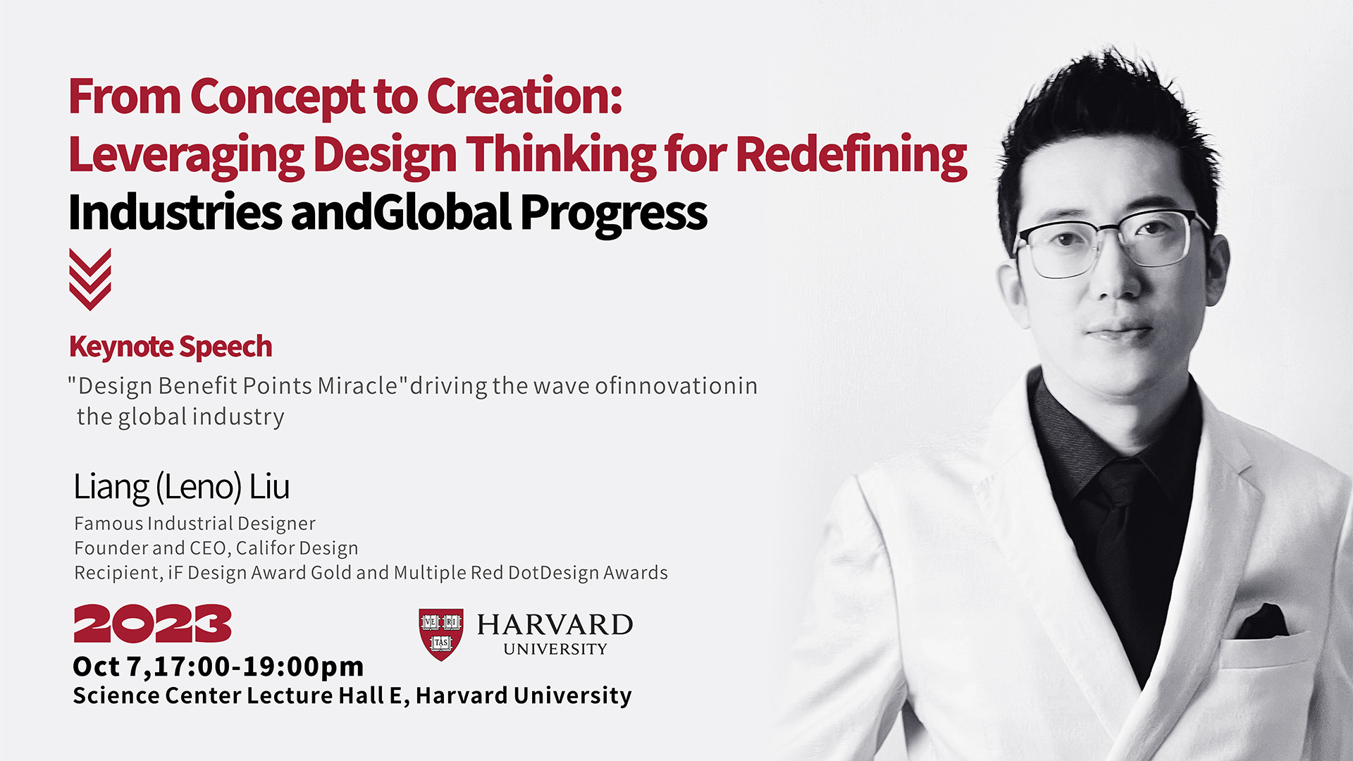 “2023年10月7日,国际知名工业设计师、加利弗创始人兼首席设计师刘亮,受邀在全球顶尖学府哈佛大学发表精彩演讲,他的演讲主题围绕着设计效益点的奇迹以及设计与可持续发展的融合,以推动全球各行各业的创新浪潮而展开。”
