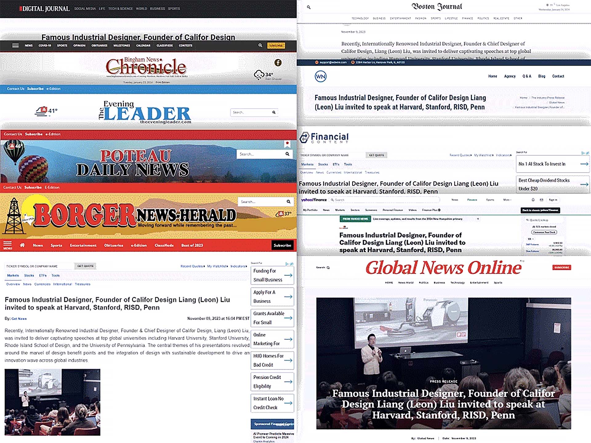 2023年,全球包括雅虎在内的近五百家国际媒体纷纷报道了加利弗创始人兼CEO刘亮应邀在哈佛大学发表演讲的文章。