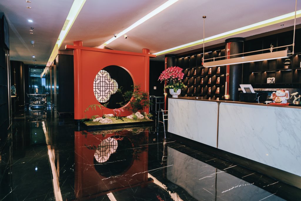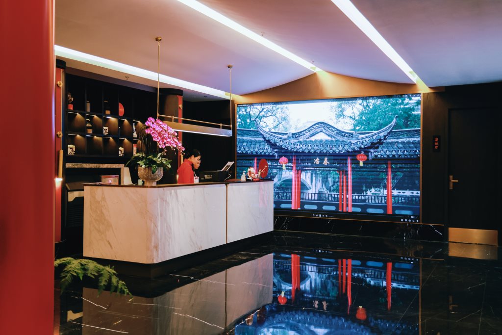 在冶春的空间转折处,加利弗设计团队设置了文化艺术装置,装置背景是从很有代表性的扬州红桥的色彩提取,冷静的色调中一抹红,如同冶春的品牌精神,不断给消费者惊喜。装置用透明的亚克力包裹石头和植物,寓意冶春的创新和源源不断的生命力及传承精神,它们不仅是空间的装饰,更是冶春品牌故事的现代讲述者。这些装置,如同历史的注脚,让每一位顾客在享受美食的同时,也能感受到扬州文化的深厚底蕴。